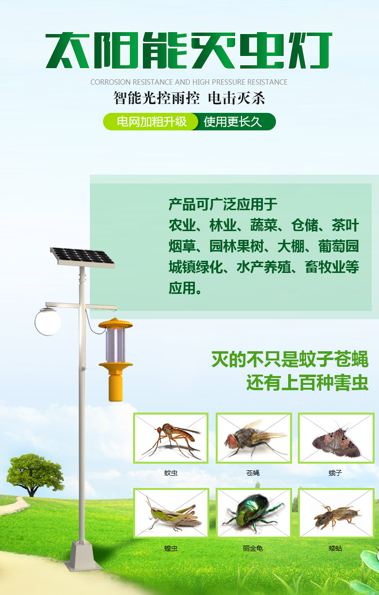 頻振式太陽能殺蟲照明一體燈具有光控、時(shí)控、雨控、過充、過放保護(hù)功能及微電腦自動保護(hù)系統(tǒng)。全天候,不怕水,耐高溫,防腐蝕,移動方便。園林公園,別墅群,庭院,藥材基地、蔬菜基地、茶園等場地使用。